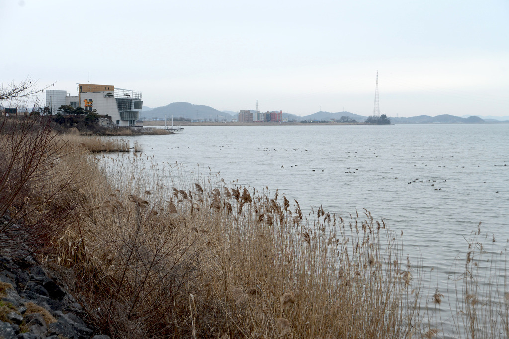 금강호에 머물고 있는 조류들을 관찰할수 있는 조류 생태관이 보인다.