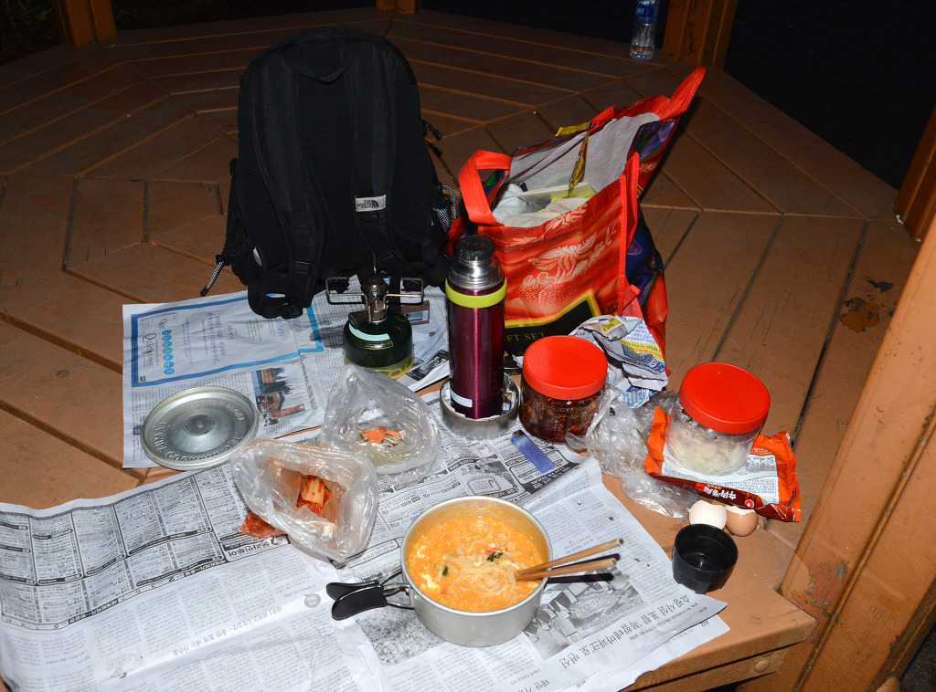금강하구둑 관광지에서 하룻밤을 묵고 이른 아침 떡 라면으로 자가 취식을 해 본다.