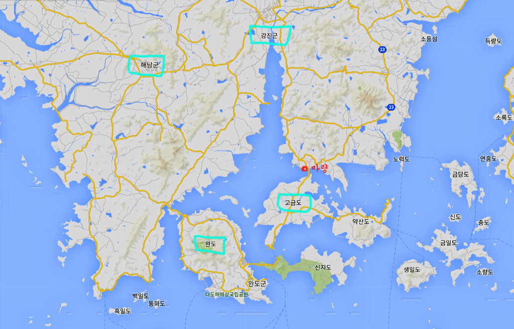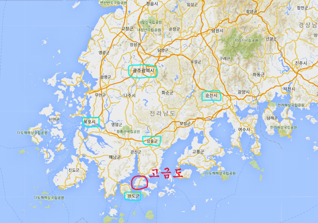 전남 완도군에 위치한 고금도의 위치