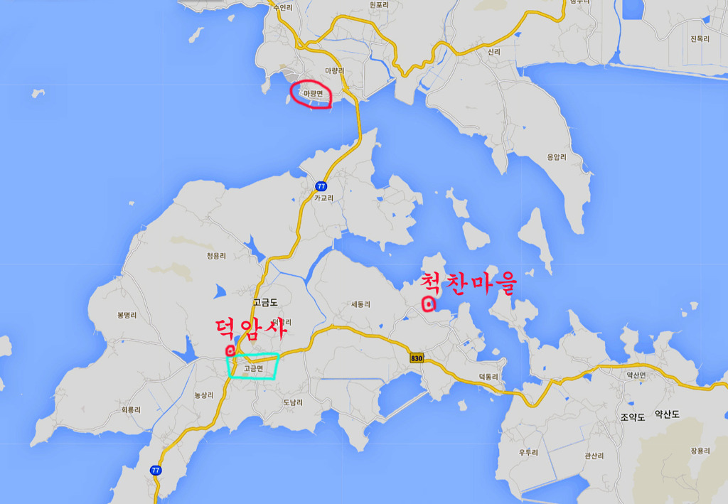 강진군 마량면을 통해 연결된 고금도 집성촌 척찬 마을과 마량의 위치