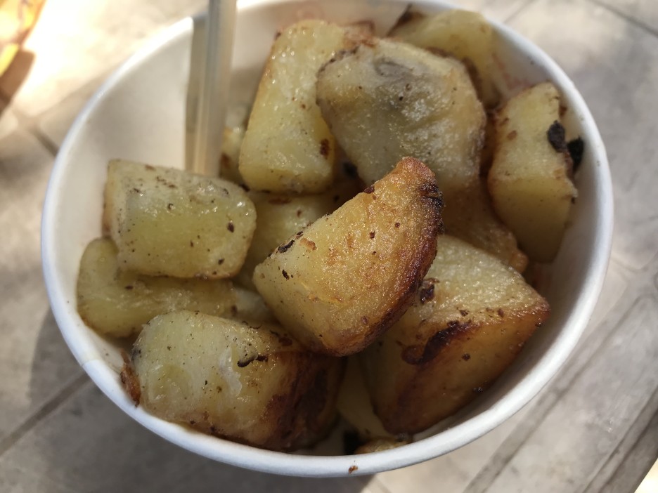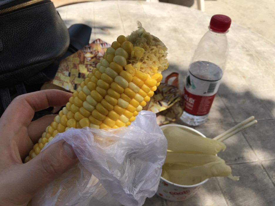 전 물 한 병하고, 감자 튀기듯 볶은 거랑 찐 옥수수 사 먹었어요. 감자가 정말 맛있었어요.