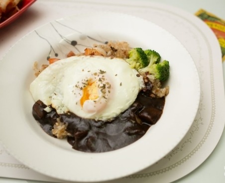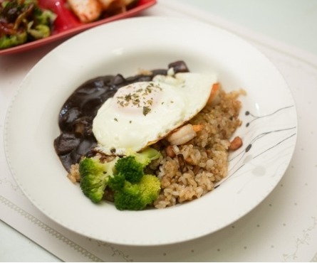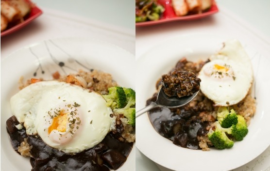 4.그릇에 볶음밥을 담고 짜장소스를 올려준 후 취향에 따라 계란후라이, 파슬리 가루등을 올려 먹는다.