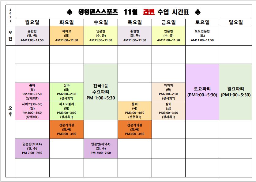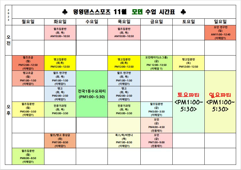 ⭐🌷윙윙댄스스포츠 11월 모던&라틴 단체반 시간표 공지🌷⭐