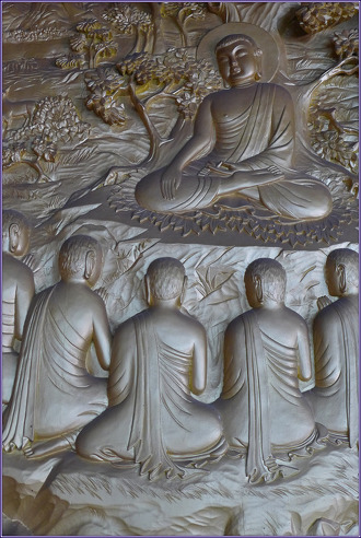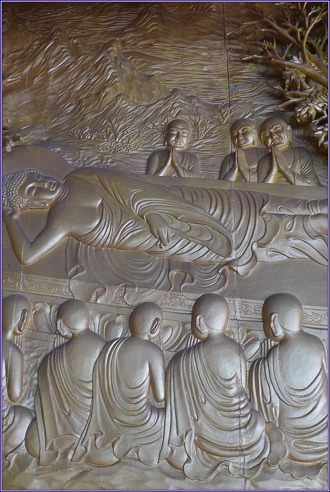 제7 녹원전법상(鹿苑轉法相) 제8 쌍림열반상(雙林涅槃相) 제7 녹원전법상(鹿苑轉法相). 석존께서 설산에서 고행을 하실 때 태자의 고행에 감명을 받으며 고행을 함께 했던 다섯 수행자가 있었는데, 그들은 태자가 6년 고행을 하고 나서 니련선하에서 목욕을 하고 유미죽을 드시는 것을 보고 "싯다르타는 타락했다"고 여겨 태자의 곁을 떠나 바라나시 녹야원에 머물러 있었는데 정각을 이루신 석존께서 이들을 찾아 녹야원으로 가시어 최초의 설법, 사제법문(四諦法門)을 베푸시니 이를 초전법륜(初轉法輪)이라 합니다. 이 다섯 수행자는 부처님께 귀의하여 오비구(五比丘)가 되었고 법문을 듣자 즉시 법안(法眼)이 열리고 아라한 성자가 되었습니다. 이들로 인하여 최초로 승가(僧伽)가 이루어졌습니다. 그 이름은 콘단냐(憍陳如)ㆍ앗사지(阿說示)ㆍ밧디야(跋提)ㆍ마하나마(摩訶男)ㆍ밥파(波濕波)입니다. 이로부터 45년간 설법이 이루어지고 사리불(舍利弗)ㆍ목건련(目犍連)을 비롯한 수많은 사람들이 불제자가 되었고 수없이 많은 사람들이 구원을 받았습니다. 제8 쌍림열반상(雙林涅槃相). 부처님께서 45년간(혹은 49년간)의 길에서 길로 중생을 제도하시었습니다. 춘추 여든에 이르시자 열반 3개월 전에 열반을 실현하실 것을 예언하시고 쿠시나가라로 향하셨습니다. 신심 깊은 대장장이 순타(純陀)의 최후의 공양을 드시고, 쿠시나가라 사라쌍수(沙羅雙樹) 사이에서 일일일야(一日一夜) 동안 <열반경>을 설하시고, 궁금한 점이 있으면 물으라 이르시고, 최후의 법등명자등명(法燈明自燈明)을 유촉하시고, 계(戒)를 스승으로 삼으라[戒爲師] 이르신 다음, 2월 보름 휘영청 밝은 달빛 아래 위대한 대열반(大涅槃)을 실현하셨습니다. 수많는 불제자들이 이를 슬퍼하였고 다비(茶毘)를 행하자 여덟 섬 너 말[八斛四斗]의 사리(舍利)가 출현하여 여덟 나라가 나누어 탑을 세우고 부처님의 위대한 덕을 기렸으며, 그후 가섭존자(迦葉尊者)를 상수(上首)로 하고 아사세왕(阿闍世王)의 후원을 받아 왕사성 7엽굴(七葉窟 畢鉢羅窟)에서 500명의 아라한이 모여 경전을 결집하여 부처님의 정법이 영원히 유통되도록 하였습니다.