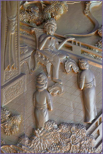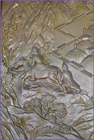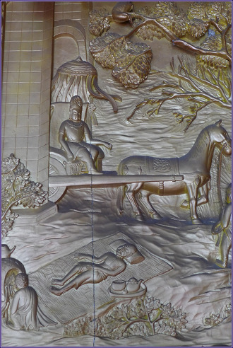 제3 사문유관상(四門遊觀相) 제4 유성출가상(踰城出家相) 제3 사문유관상(四門遊觀相). 싯다르타 태자는 성장하면서 궁중에서 호화로운 생활을 하면서도 생로병사(生老病死)에 대한 인생고를 깊이 명상했습니다. 이에 부왕은 기분전환을 시킬 겸 해서 태자로 하여금 사대문 밖을 유람하게 하는데, 동문 밖에서 늙은 자의 초췌한 모습을 보고 노고(老苦) 느꼈으며, 남쪽 문 나갔을 때는 병든 자의 모습을 보고 병고(病苦)를 목도했으며, 서쪽에서는 죽은 자의 모습을 보고 가장 슬픈 사고(死苦)를 느꼈습니다. 북쪽 문 나갔을 때는 사문(沙門)을 만나 평온한 수행자의 모습을 보고 출가만이 생로병사의 고통을 벗어나는 길임을 자각하게 됩니다. 제4 유성출가상(踰城出家相). 싯다르타 태자가 사문유관 후 출가를 결심하자 부왕은 출가를 방해할 목적으로 삼시전(三時殿)을 지어 향락을 즐기도록 했으나 출가의 기회를 얻고자 했는데... 이런 가운데 태자가 29세가 된 야수다라 태자비가 아들을 낳으니 태자는 출가를 방해하는 장애물이 태어났다고 "라훌라!"라 하였는데 그대로 그것이 이름이 되었습니다. 모두가 잠든 2월 8일, 태자는 가만히 마부 찬타카[車匿]를 불러 칸타카[犍陟]를 대령하도록 하여 칸타카를 타고 성을 넘어서 위대한 출가를 단행하게 됩니다.
