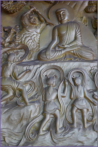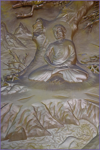 제5 설산수도상(雪山修道相) 제6 수하항마상(樹下降魔相) 제5 설산수도상(雪山修道相). 유성출가한 태자는 스스로 머리를 자르고 출가의 길에 들어섰고 당시에 명성이 있는 스승들을 찾아 구도를 했으나 그들의 경지에 이르러도 생사를 해결할 수 없음을 알고 그들을 떠나 설산에 들어가서 스스로 6년 동안 가혹한 고행을 하여 피골이 상접하게 되었지만 고행으로는 깨달음을 얻을 수 없음을 깨닫고 니련선하에 몸을 씻고 선생녀로부터 유미죽을 공양 받고 기력을 회복한 후 보리수(菩提樹) 아래로 가서 정진하게 됩니다. 제6 수하항마상(樹下降魔相). 태자가 35세가 되던 해, 6년의 고행 후 보리수 아래에서 가부좌를 틀고 깨달음을 이루기 전에는 일어나지 않으리라는 서원을 세우고 지금까지 닦아 온 이치를 하나하나 점검하고 십이인연법(十二因緣法)을 순관(順觀)하고 역관(逆觀)하면서 최상의 정각(正覺)을 성취하게 되는 금강삼매(金剛三昧)에 들자 이에 놀란 마왕 파순(波旬)은 필사적으로 정각을 방해 하려고 하였습니다. 미녀와 마군을 동원하여 막아보려 했지만 요지부동으로 무위로 끝났습니다. 마왕과 마군의 항복을 받고 이튿날 납월 8일 동녘에서 떠오르는 샛별을 마주한 찰나, 큰 지혜의 광명이 개발되며 최상의 정각을 이루니 이것을 일체종지(一切種智)라고 합니다. 이를 '아뇩다라삼먁삼보리(阿耨多羅三藐菩提)'라 하고 '무상정등정각(無上正等正覺)'이라 하며 '위 없이 높고 바르며 크고도 넓으며 평등한 깨달음'이라 합니다. 천상천하에 가장 위대한 부처님이 되신 것입니다.