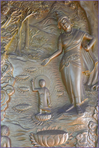 제1 도솔내의상(兜率來儀相) 제2 비람강생상(毘藍降生相) 제1 도솔내의상(兜率來儀相). 석가모니불의 전신인 일생보처(一生補處)로서의 호명보살(護明菩薩)이 도솔천에서 육아백상(六牙白象)을 타고 내려오면서 사바세계 카필라성 정반왕궁의 마야부인(摩耶夫人)께 입태하는 모습이 묘사되어 있습니다. 특히 육아백상이란 여섯 개의 어금니를 가진 흰 코끼리는 6바라밀을 실천하여 세상을 희고 깨끗하게 할 것을 상징한 것입니다. 제2 비람강생상(毘藍降生相). 태자를 잉태한 마야부인은 당시의 풍속을 따라 친정으로 하는 도중 화창한 봄날 룸비니동산에서 잠시 쉬며 꽃구경을 하는 도중 태기를 느껴 무우수(無憂樹) 가지를 잡고 우협(右脇)으로 태자를 출산하게 됩니다. 상서광명 가득한 꽃피고 새우는 4월 초파일입니다. 강탄한 태자는 오른손으로 하늘을 왼손으로는 땅을 가리키며 일곱 걸음을 옮기자 땅에서 연꽃이 떠올라 태자를 떠받들었고, 태자는 "천상천하유아독존(天上天下唯我獨尊)!"이라 외쳤습니다. 이렇게 태어난 태자는 싯다르타(悉達陀)라 명명했습니다.