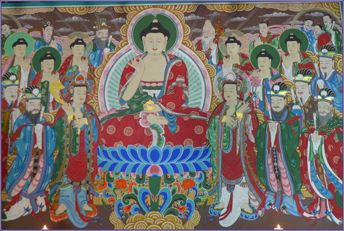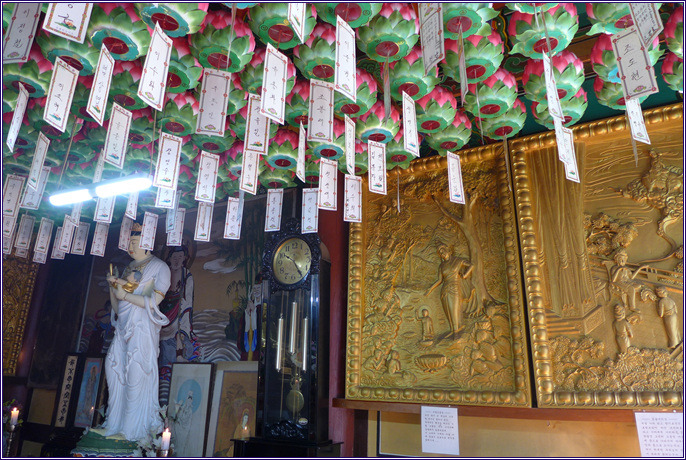 대웅전(大雄殿) 대웅전에 참배객들이 부절하여 온전한 모습을 담기 어렵네요. 그래도 절을 찾는 분들이 많아서 기분은 좋습니다. 대웅전은 정면 3칸 측면 2칸의 팔작지붕 건물로 밑에는 종무소이고 계단을 오르면 법당입니다. 대웅전의 주련의 내용은 찬불게로 널리 알려진 게송입니다. 佛身普遍十方中 (불신보변시방중) 부처님 몸 두루하여 시방세계 충만한데 三世如來一切同 (삼세여래일체동) 삼세의 여래 또한 모두가 한 몸일세. 廣大願雲恒不盡 (광대원운항부진) 넓고 크신 자비원력 항상하여 다함없고 汪洋覺海妙難窮 (왕양각해묘난궁) 넓고 넓은 깨침바다 헤아리기 어렵다네.