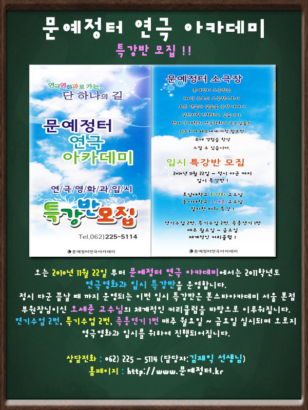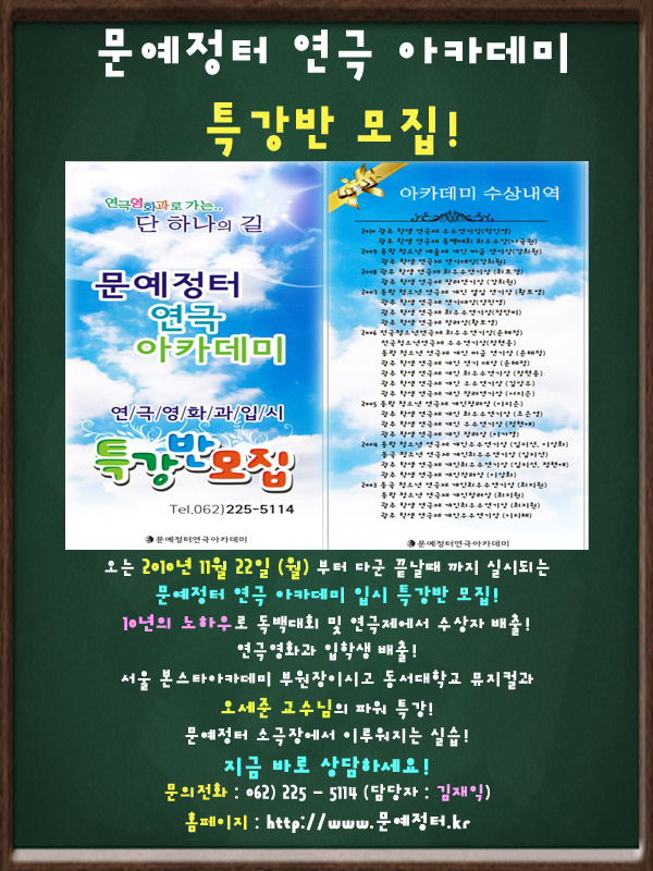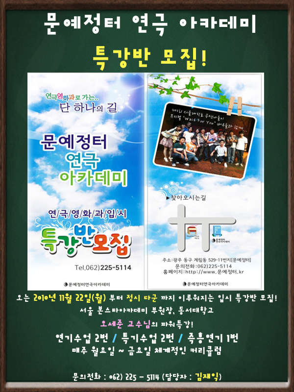 [친해지고 싶어요.]광주 최고의 명문 아카데미 "문예정터" 지금 기회입니다. 작성자산소|작성시간10.11.25|조회수7 목록 댓글 0 글자크기 작게가 글자크기 크게가 다음검색 현재 게시글 추가 기능 열기 북마크 공유하기 신고 센터로 신고 댓글 댓글 0 댓글쓰기 답글쓰기 댓글 리스트