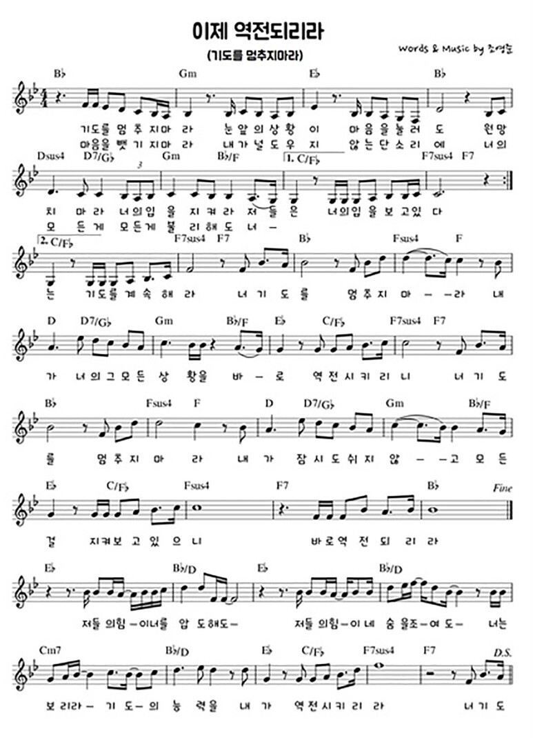 기도를 멈추지 마라 눈앞의 상황이 마음을 눌러도 원망치 마라 너의 입을 지켜라 저들은 너의 입을 보고 있다 마음을 뺏기지 마라 내가 널 도우지 않는단 소리에 너의 모든 게 모든 게 불리해도 너는 기도를 계속해라 너 기도를 멈추지 마라 내가 너의 그 모든 상황을 바로 역전시키리니 너 기도를 멈추지 마라 내가 잠시도 쉬지 않고 모든 걸 지켜보고 있으니 바로 역전되리라 저들의 힘이 너를 압도해도 저들의 힘이 네 숨을 조여도 너는 보리라 기도의 능력을 내가 역전시키리라 너 기도를 멈추지 마라 내가 너의 그 모든 상황을 바로 역전시키리니 너 기도를 멈추지 마라 내가 잠시도 쉬지 않고 모든 걸 지켜보고 있으니 바로 역전되리라 [출처] 이제 역전되리라(기도를 멈추지마라) - 시와그림(가사,악보,듣기)|작성자 Nova