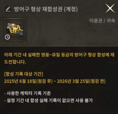 - 방어구 형상 재합성권 대상 기간 : 2025.6.18(수, 점검 후) ~ 2026.3.25(수, 점검 전)