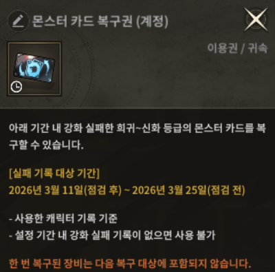 - 몬스터 카드 복구권 대상 기간 : 2026.3.11(수, 점검 후) ~ 2026.3.25(수, 점검 전)
