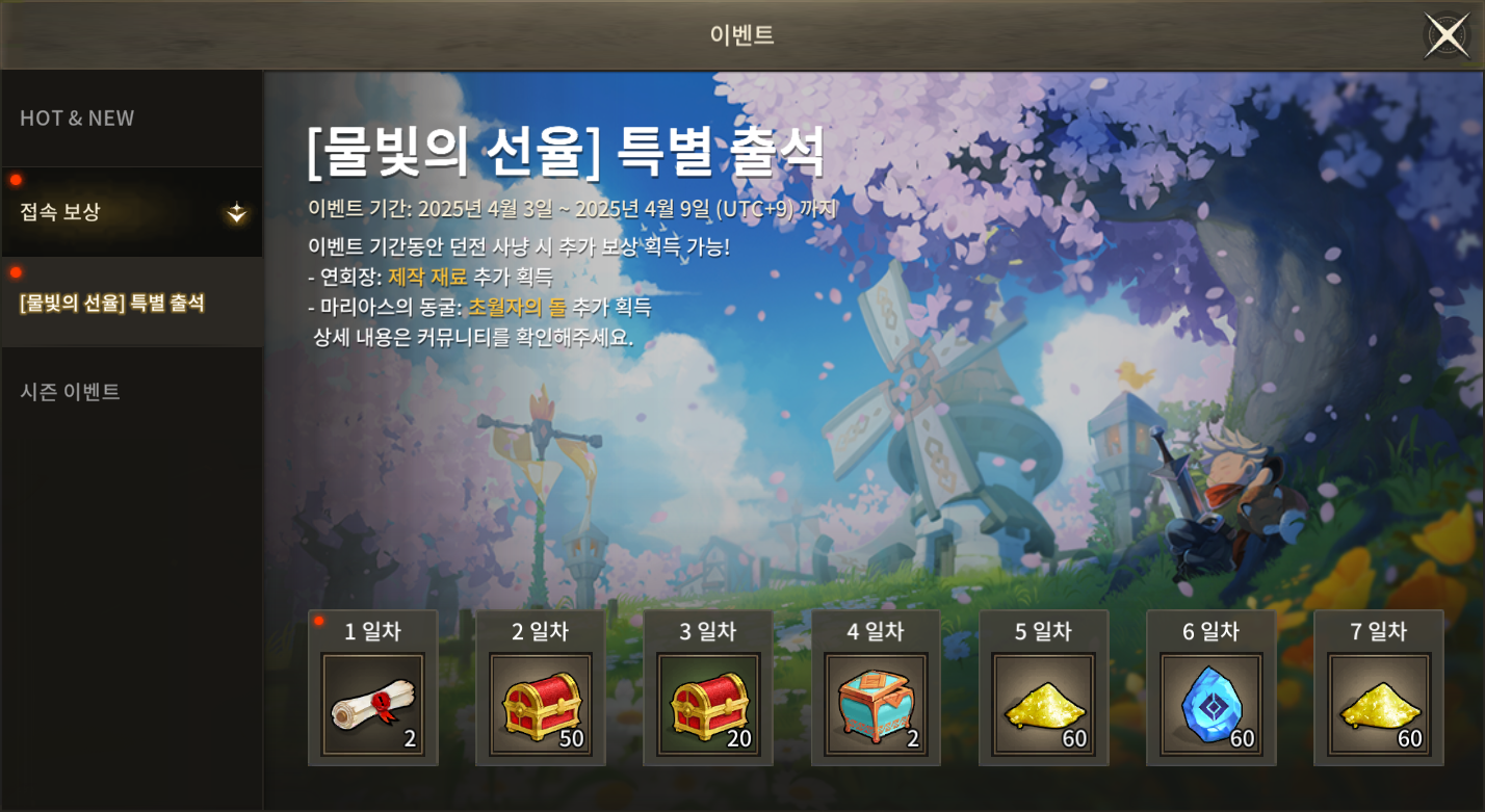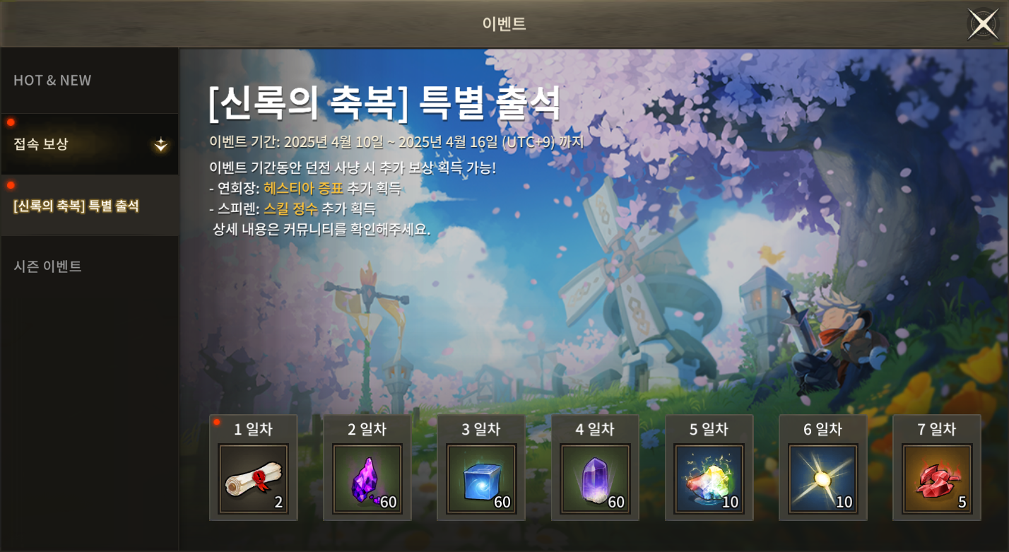 - 게임에 접속하시면 이벤트 페이지에서 [신록의 축복] 특별 출석 이벤트를 확인하실 수 있습니다.