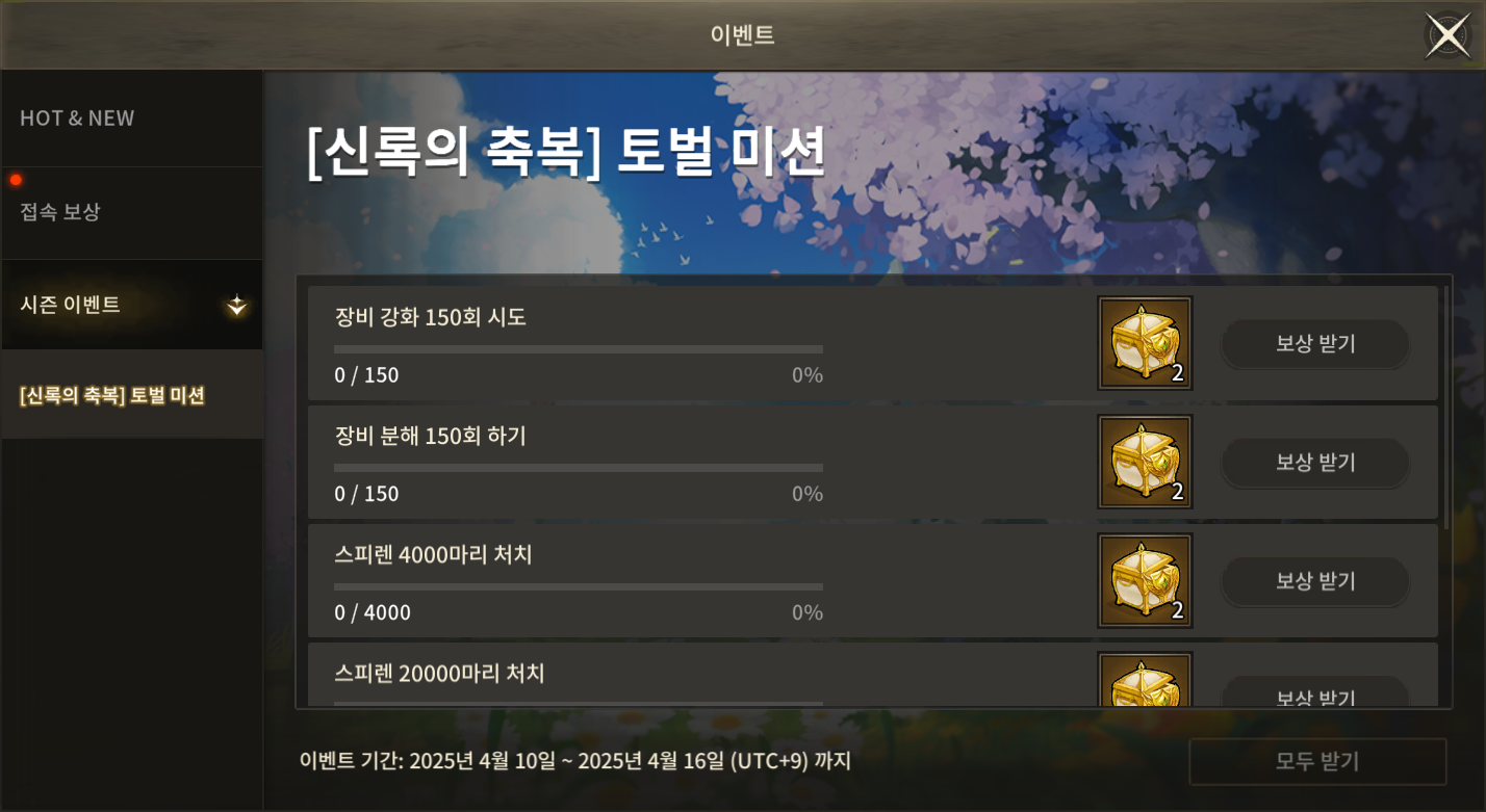- 게임에 접속하시면 이벤트 페이지에서 [신록의 축복] 토벌 미션 이벤트를 확인하실 수 있습니다.