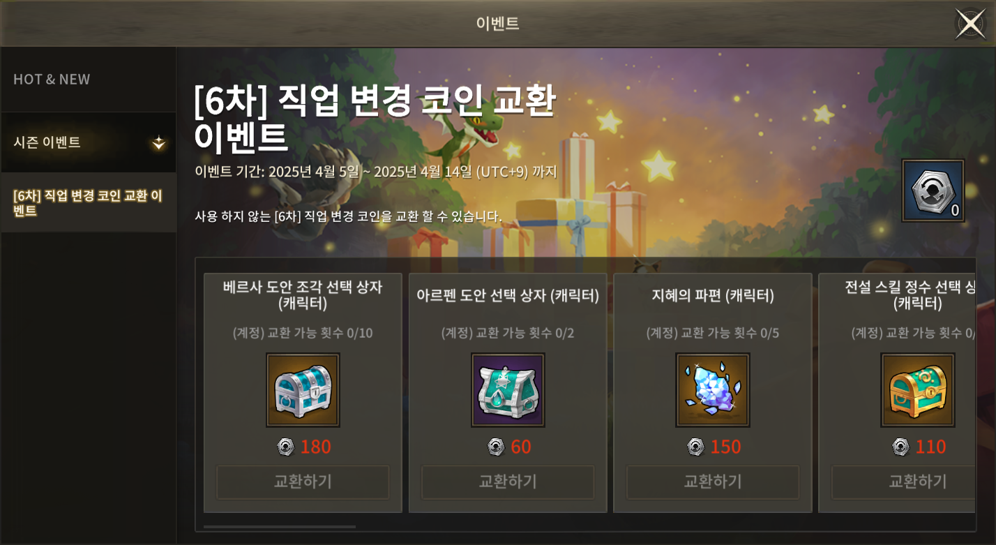 - 사용하지 않은 직업 변경 코인은 아래 보상으로 교환하실 수 있습니다.