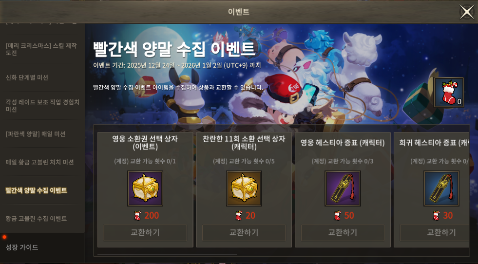 - 게임에 접속하시면 이벤트 페이지에서 [빨간색 양말] 수집 이벤트를 확인하실 수 있습니다.