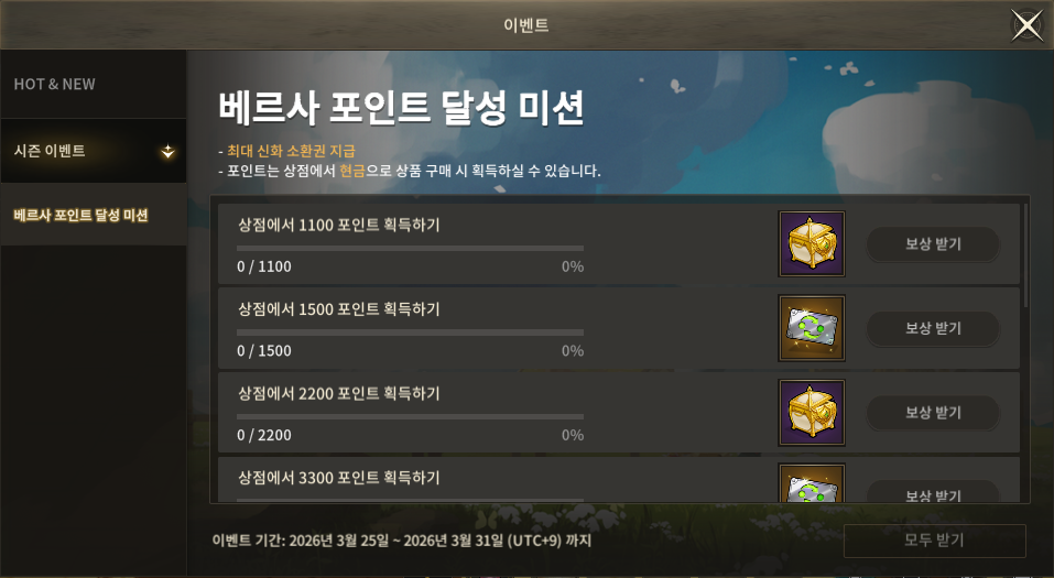 상점에서 상품을 구매하면 최대 신화 소환권 선택 상자가 제공되는 베르사의 포인트 미션이 진행됩니다.