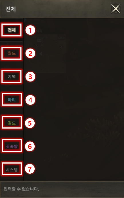 | 7 | 시스템 | 게임 내의 시스템 메시지를 보여줍니다. 채팅을 입력할 수 없습니다. |
