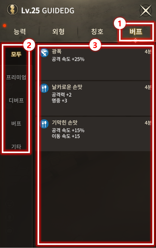 | 1 | 버프 탭 | 터치 시 버프 탭으로 이동합니다. |