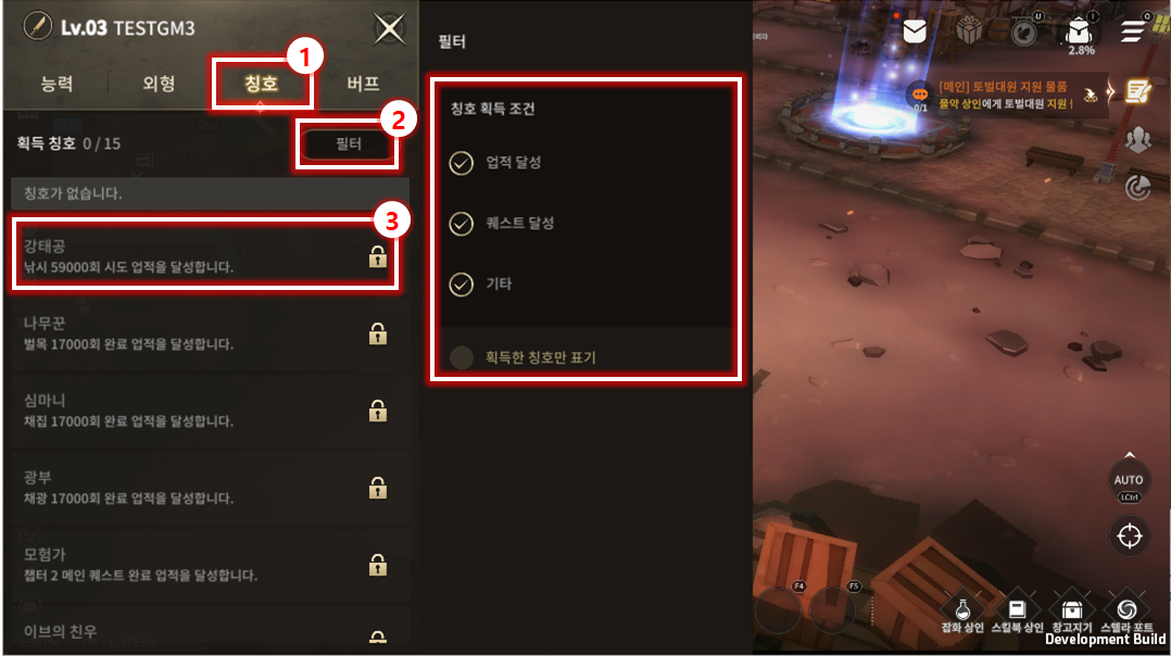 | 2 | 칭호 필터 | 조건을 걸어 칭호들을 정렬할 수 있는 기능입니다. |
