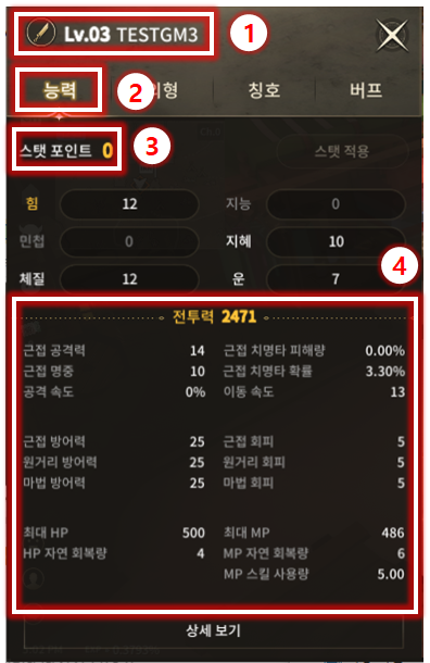 | 2 | 능력 | 캐릭터의 현재 능력을 보여주는 탭입니다. 분배하지 않은 스탯포인트가 있을 경우 빨간색 점 표시가 나타납니다. |