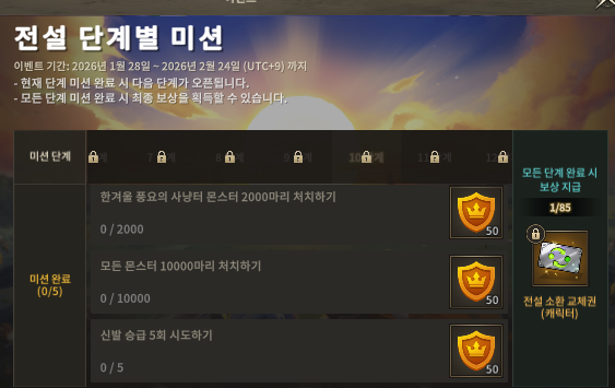 전설 단계별 미션 일일이 확인 하시면서 계획을 잡으세요. 1월28일 부터 2월24일까지.