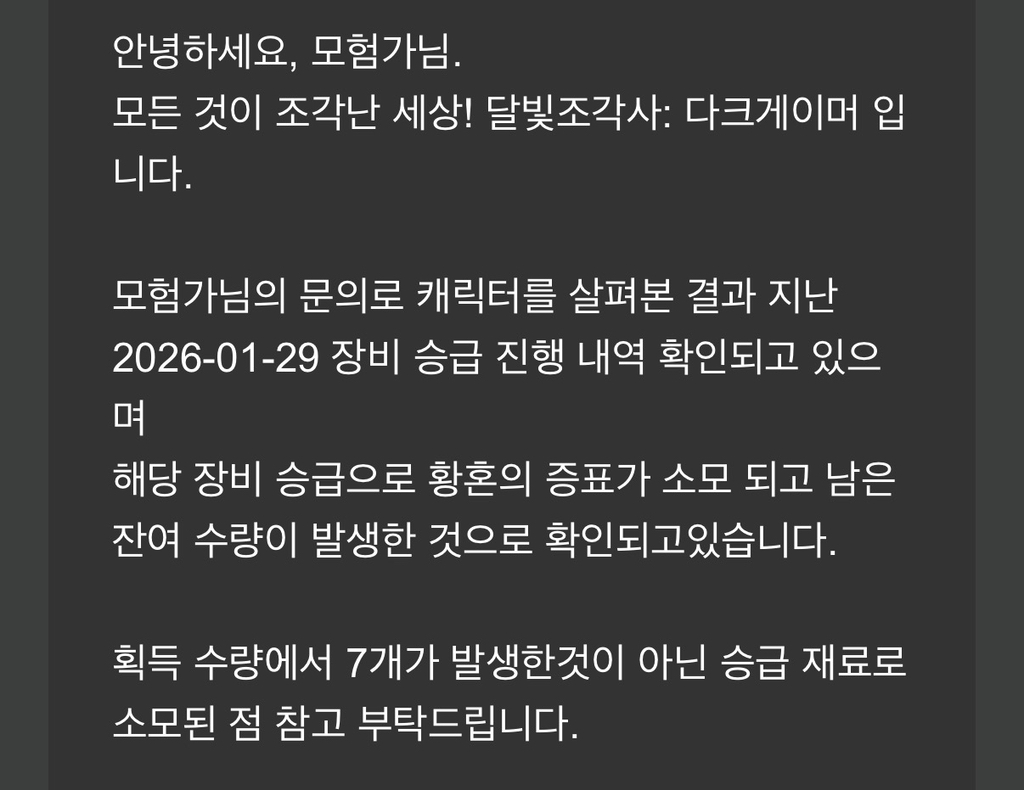 추가로, 잘못 사용된 재화는 복구를 진행해드릴 예정이며, 영광의 증표는 회수될 예정인 점 참고 부탁드립니다.