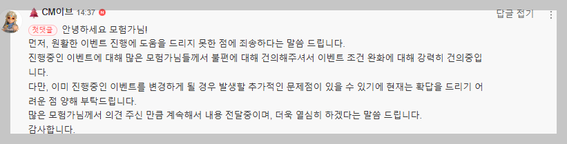 다시 한 번, 주신 의견에 감사드리며 많은 모험가님께서 보다 즐겁게 게임을 이용하실 수 있도록 노력하겠습니다.