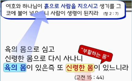 (고전 15:42~45- 죽은 자의 부활도 이와 같으니 썩을 것으로 심고 썩지 아니할 것으로 다시 살며 욕된 것으로 심고 영광스러운 것으로 다시 살며 약한 것으로 심고 강한 것으로 다시 살며 육의 몸으로 심고 신령한 몸으로 다시 사나니 육의 몸이 있은즉 또 신령한 몸이 있느니라 기록된 바 첫 사람 아담은 산 영이 되었다 함과 같이 마지막 아담은 살려주는 영이 되었나니)