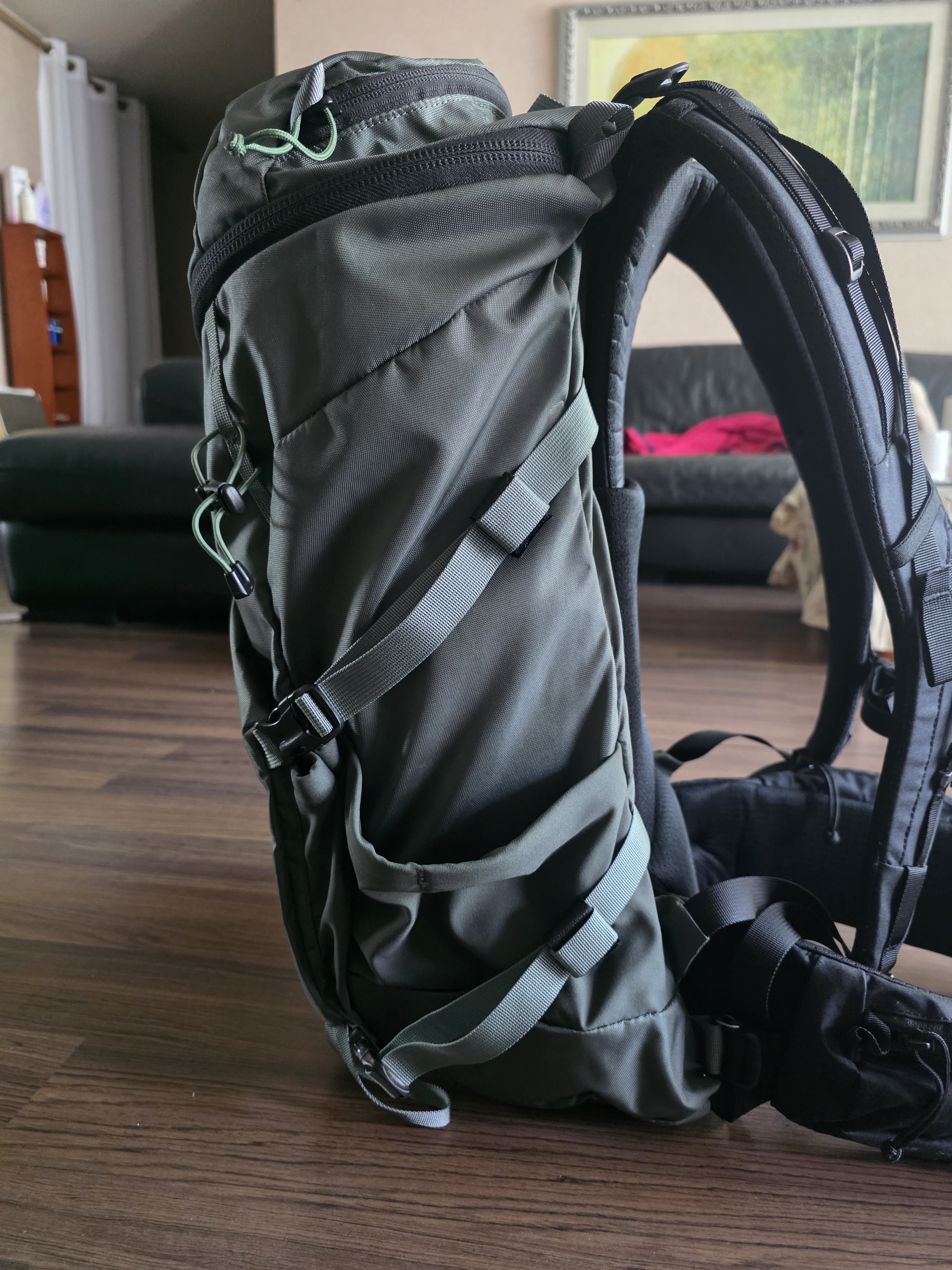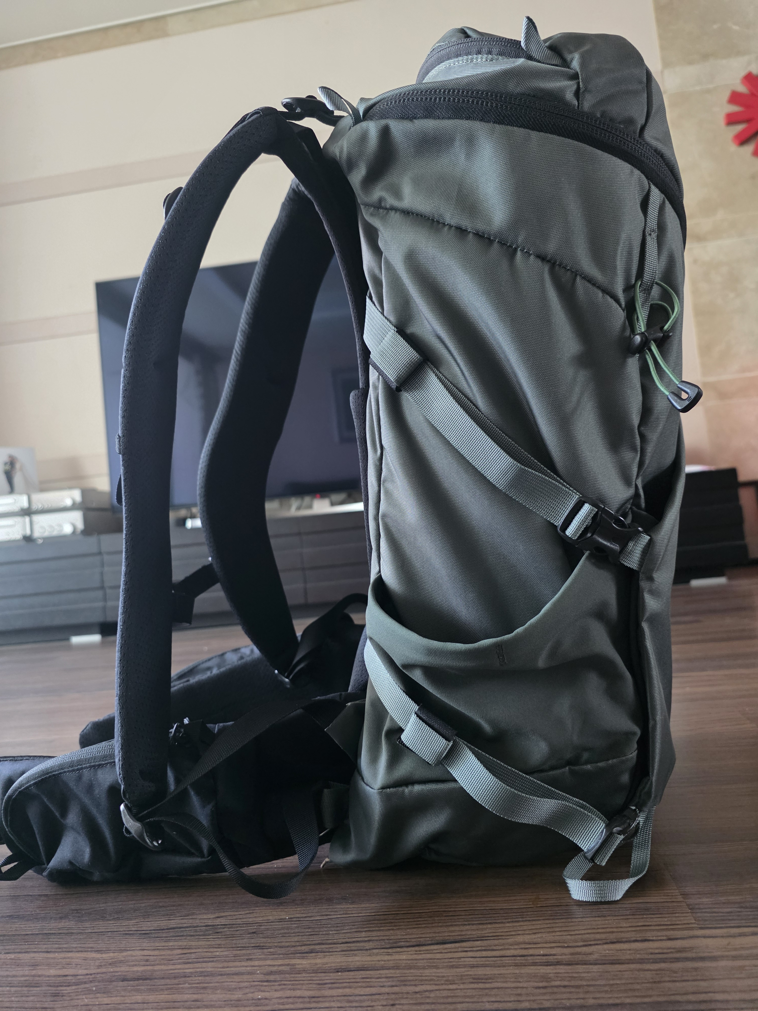 + 전면의 포켓은 옆 쪽이 스트레치 처리 되어 있으며 배낭의 좌우 스트랩과 연결 되어 내용물에 맞춰 조일 수 있습니다. 사용 하지 않는 경우에도 바짝 조여 둘 수 있습니다.