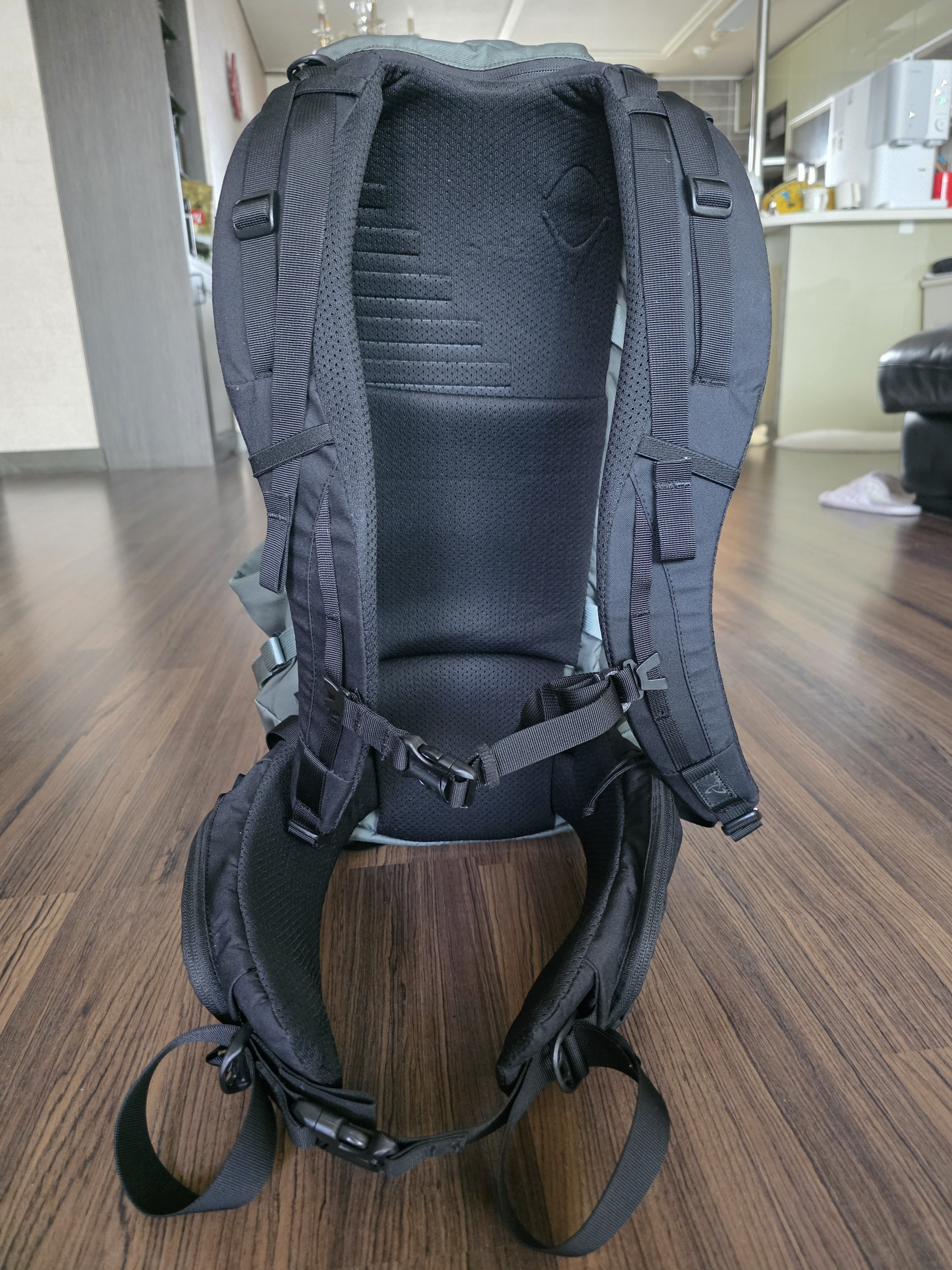 + 등판에는 물탱크를 넘을 수 있는 포켓이 있으며 물탱크 호스를 등판으로 뺄 수 있는 별도의 구멍이 있음