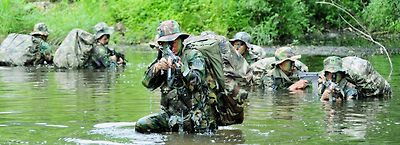 육군2군단 특공연대 2대대 장병들이 동해안 취약지 상주훈련의 일환으로 19일 강원 간성읍 냉철리 계곡에서 적지 종심지역 침투간 위험지역 극복 훈련을 실시하고 있다. |