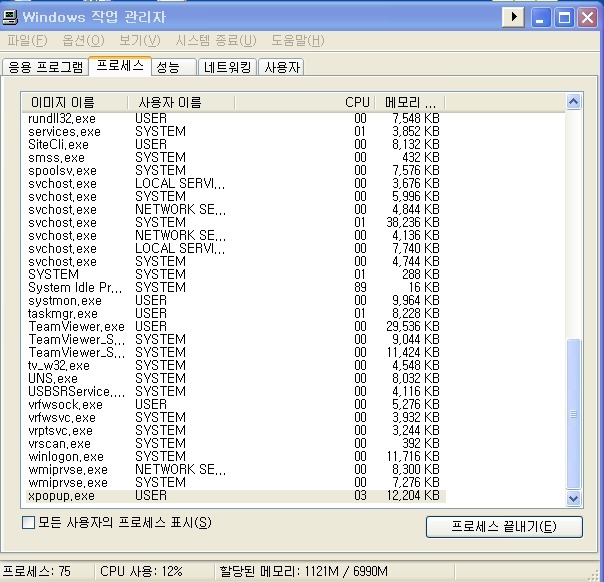 아래 그림과 같이 xpopup.exe 프로세스의 cpu 점율이 10%이하로 지속되면 꺼지지가 않았습니다.