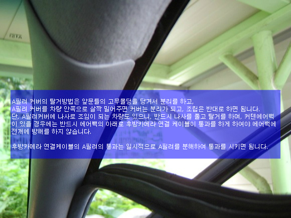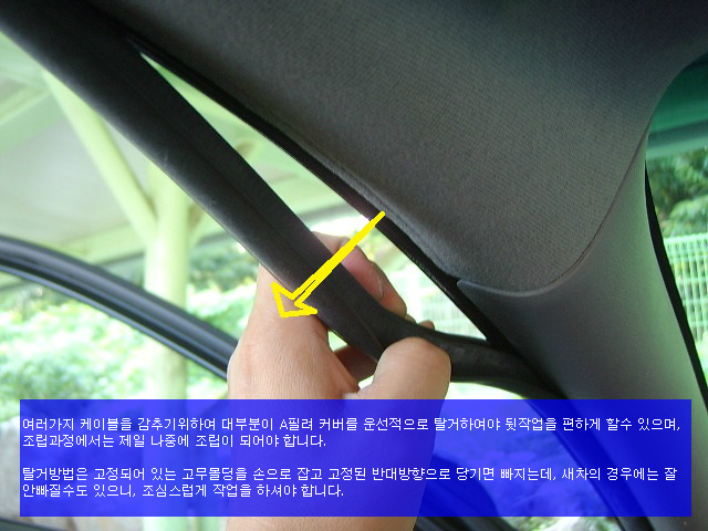 할 경우에 편리하게 작업을 할수 있습니다. A필려의 탈거는 우선적으로 차량의 문틀에 고정되어 있는 고무몰딩을