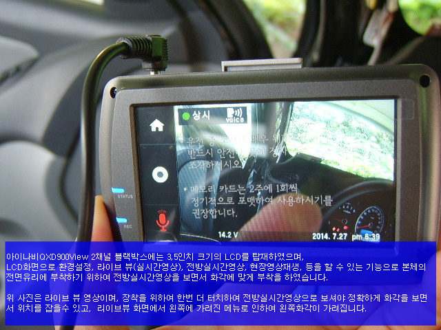 위 사진은 라이브 뷰 영상이며, 장착을 위하여 한번 더 터치하여 전방실시간영상으로 보셔야 정확하게 화각을 보면서