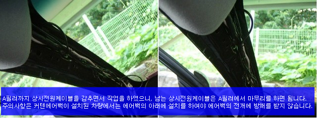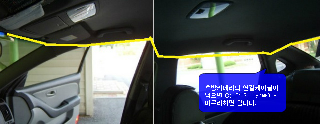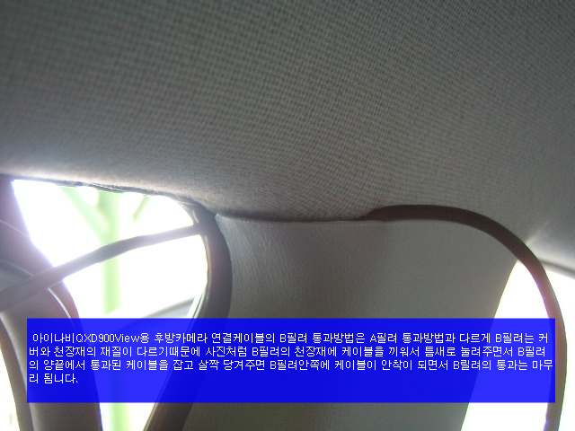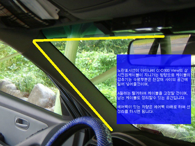 있는 공간으로 커텐과 측면 에어백이 있는 차량은 에어백의 아래로 지나가게 하여 케이블정리를 하면 됨니다.