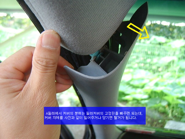 A필려 커버의 탈거방법은 앞문틀의 고무몰딩을 당겨서 분리를 하고,