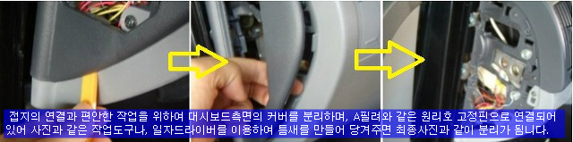 접지의 연결과 편안한 작업을 위하여 대시보드측면의 커버를 분리하며, A필려와 같은 원리로 고정핀으로 연결되어 있어