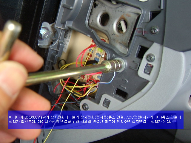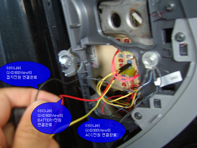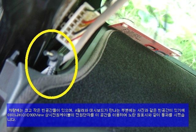 아이나비QXD900View 상시전원케이블의 전원단자를 이 공간을 이용하여 노란 원표시와 같이 통과를 시켰습니다.