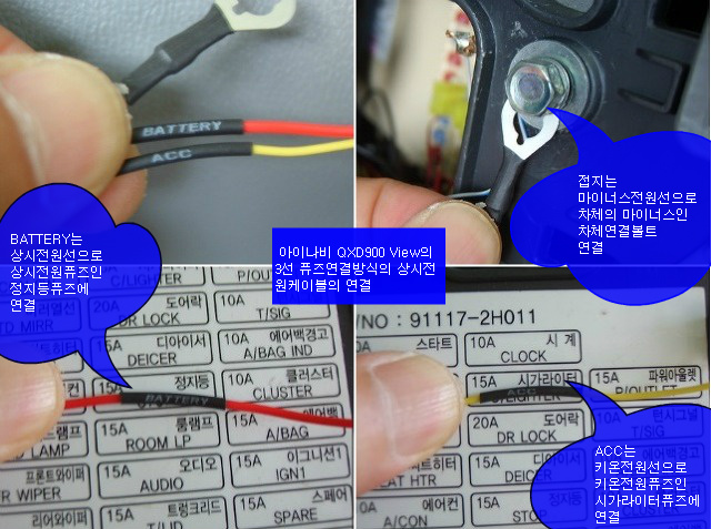 아이나비 QXD900 View의 3선 퓨즈연결방식의 상시전원케이블의 연결은