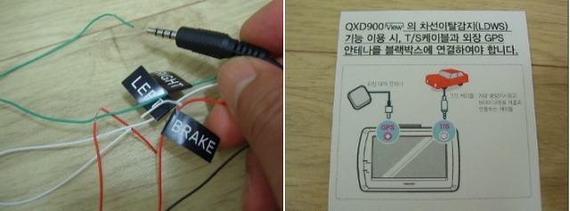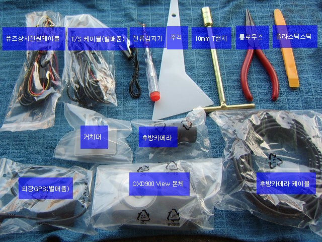 사진처럼 장착에 필요한 준비물은 qxd900view의 기본구성품과 별매품인 LDWS케이블, 외장GPS, 간단한 롱로우즈