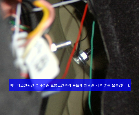 T/S케이블의 마이너스 전원선인 검정선은 좌측의 트렁크 안쪽 볼트에 연결을 하였습니다.
