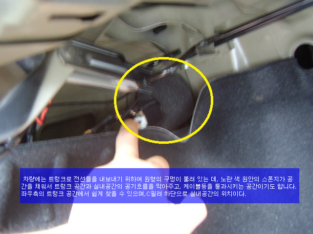 C필려에서는 C필려커버를 분리하여 차량의 실내에서 트렁크로 빠지는 공간을 이용하여 케이블을 통과시키면 됨니다.
