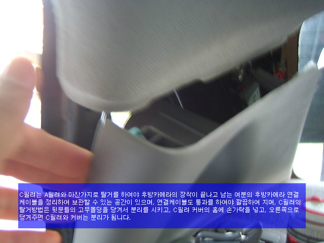 C필려의 탈거방법은 뒷문틀의 고무몰딩을 당겨서 분리를 시키고, C필려 커버의 홈에 손가락을 넣고,