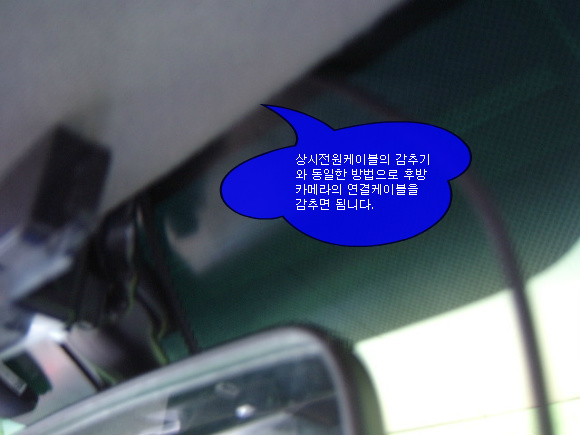 본체에 후방카메라의 연결케이블을 연결한 이후에 연결케이블을 전면유리에서 감추기는 상시전원케입블의