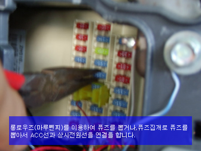 고무몰딩을 당겨서 분리를 하고, A필려의 커버까지 탈거를 하였으면, 퓨즈박스에 상시전원케이블의 연결작업을