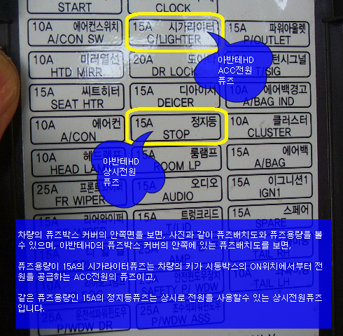 빠져나가므로 블랙박스등과 같은 추가적인 전자기기의 퓨즈연결 전원케이블의 작업은 퓨즈슬롯의 왼쪽슬롯에 걸어주면
