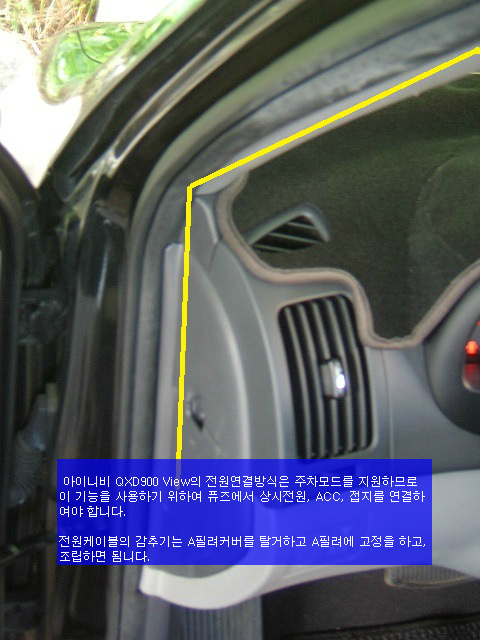 노란표시선이 아이나비 QXD900 View의 상시전원케이블이 지니가는 방향으로 케이블의 감추기는 수평부분은