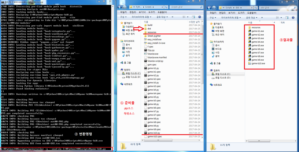 game-b10.exe 컴파일 파일로 변환해준다........( Scripts폴더 작업 -> dist폴더 exe생성 )