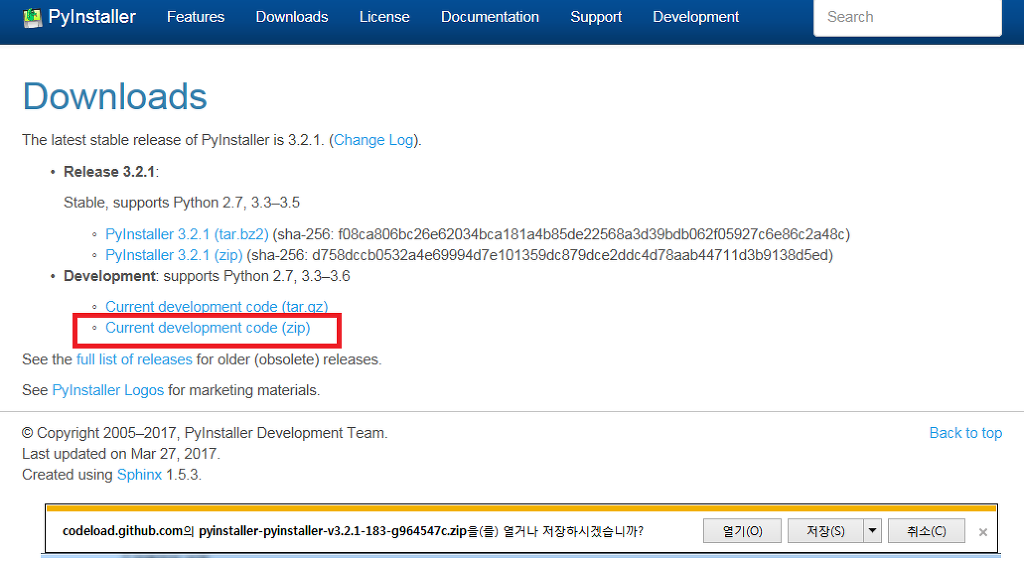개발자 버전을 d:\pyinstaller 폴더에 다운받았다면